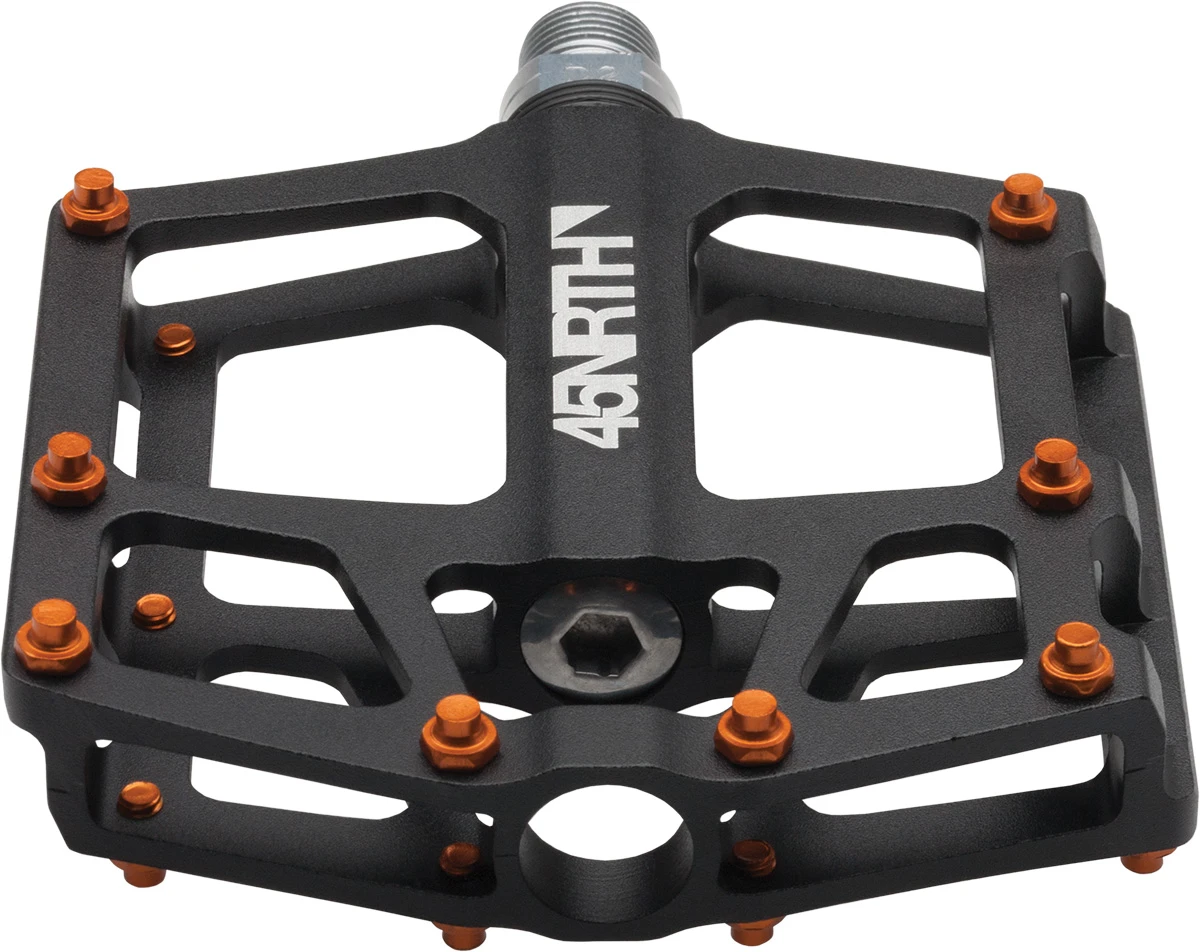 A wide flat pedal with wicked grip, 45NRTH’s Heiruspecs deliver supreme contact with the bottom of your traditional winter boots. The big CNC-extruded body provides a massive footprint and 16 alloy pins spread across the concave body to provide the ultimate grip. Sealed DU bearings keep them spinning smooth and replacement pin kits are available (sold separately) in seven different colors so you can color-coordinate your rig.