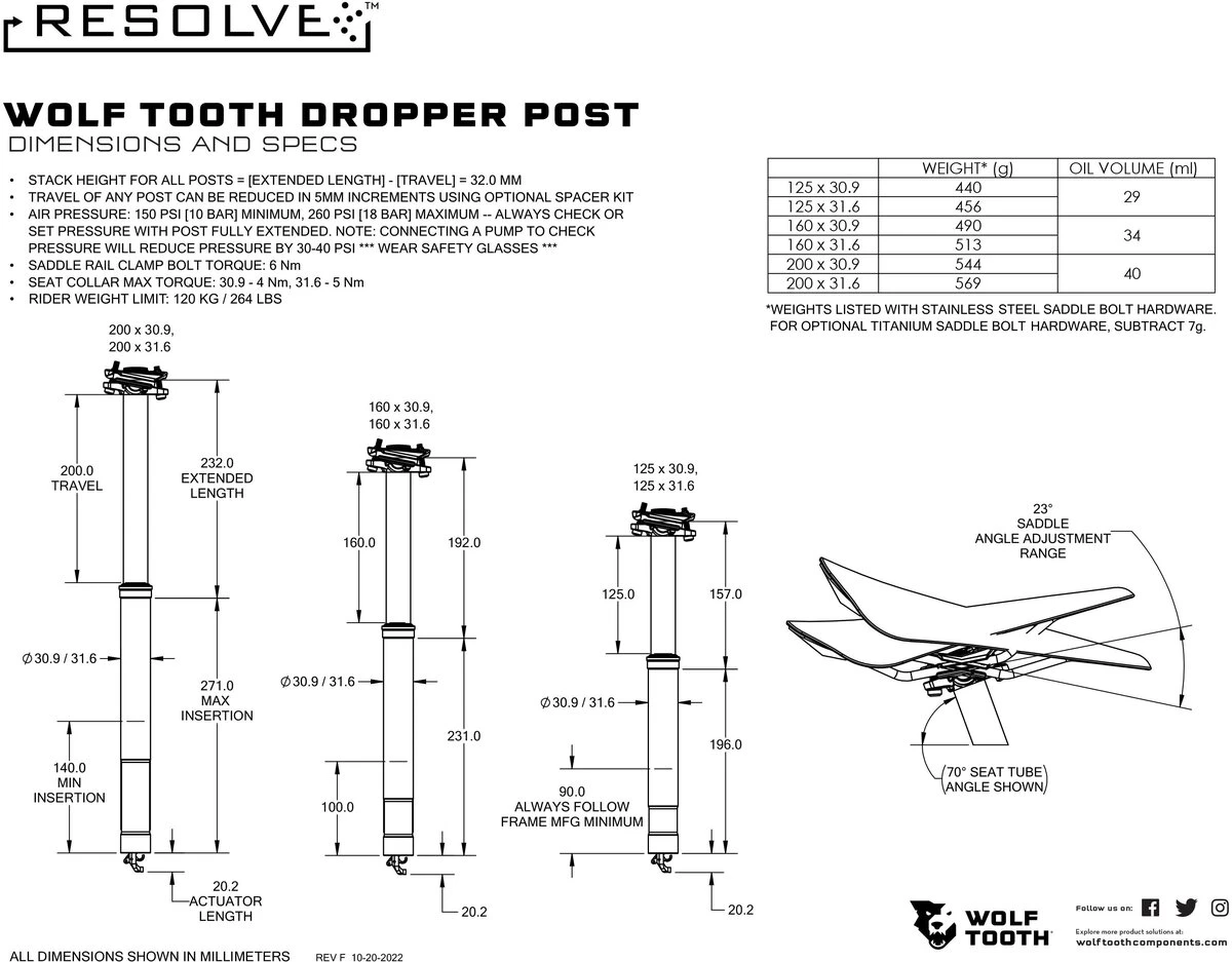 – Shortest Stack Height: The shortest stack height of any dropper post means that Resolve can get your saddle lower than any other dropper post. The lower your saddle, the more room you have to maneuver your bike on drops and techy descents.